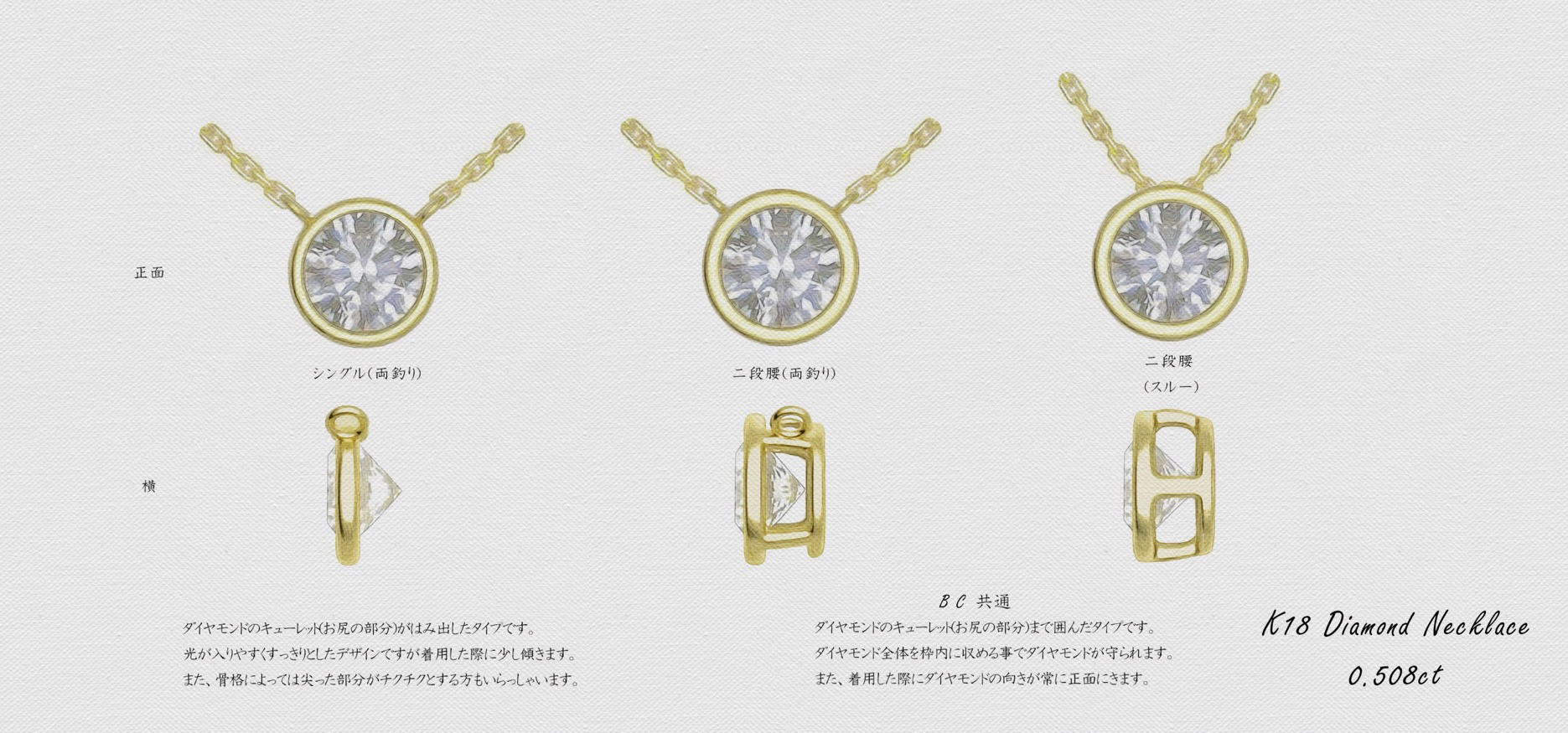 ・上画像右側は中央と同じデザインですが吊るし方が異なります。中央は両釣り、右側はチェーンを直接通すスルータイプでダイヤモンドの位置が一段階下がります。