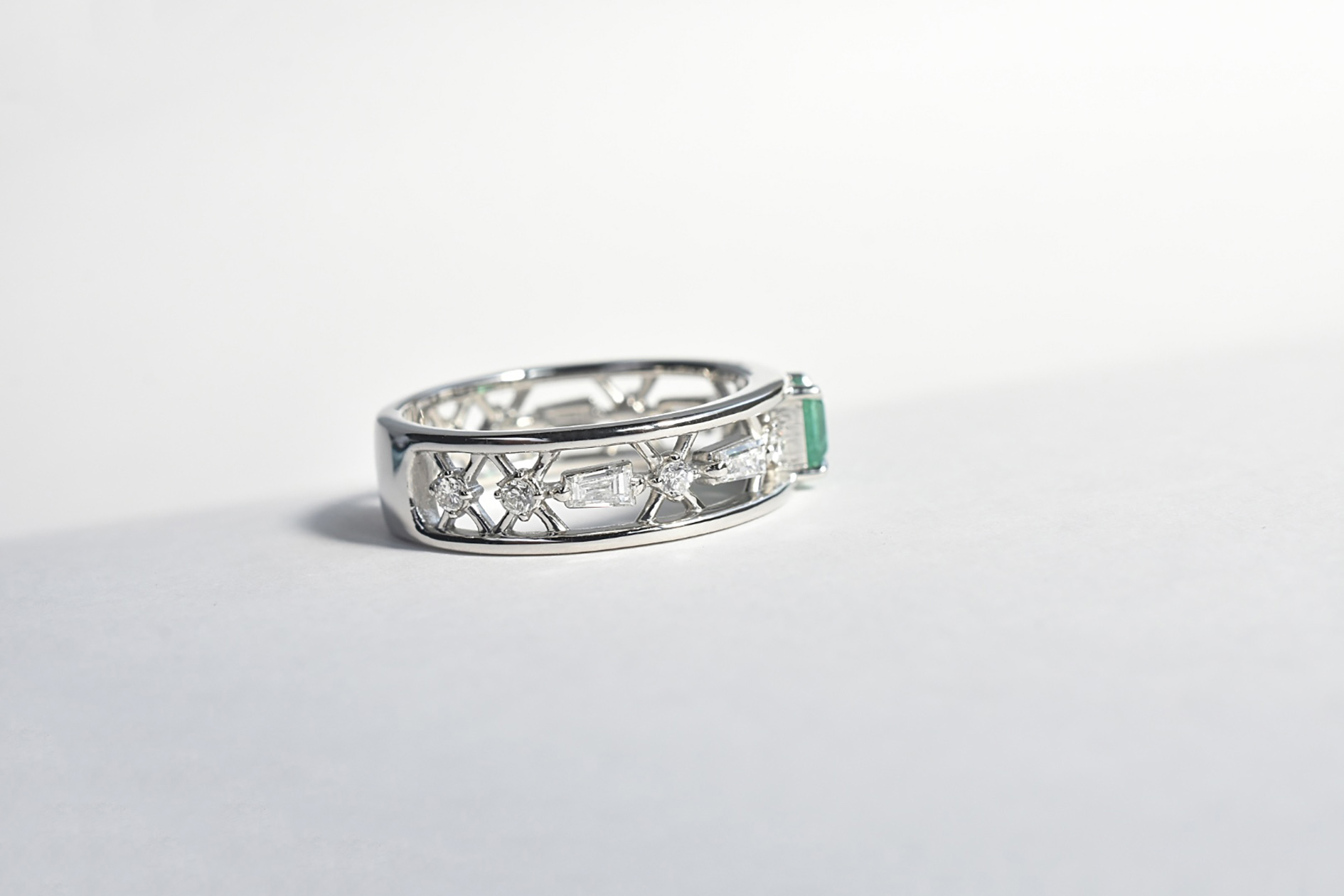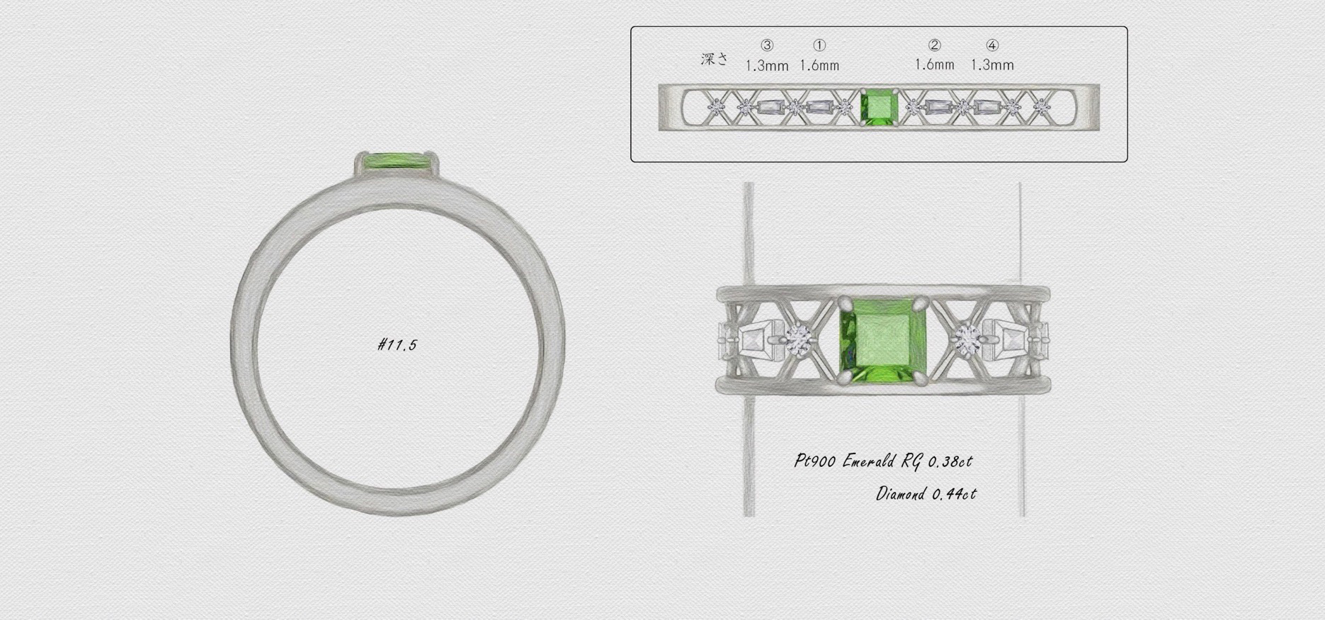 オリジナルジュエリーのデザインリングを気に入っていただいたのでそちらをアレンジ。エメラルドをメインに透かしの効いたワイドラインからダイヤモンドをシンメトリーにセッティング。