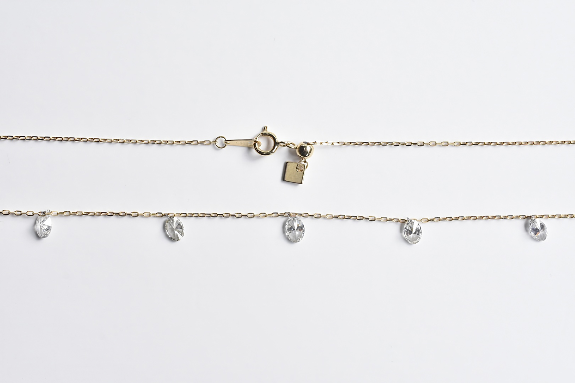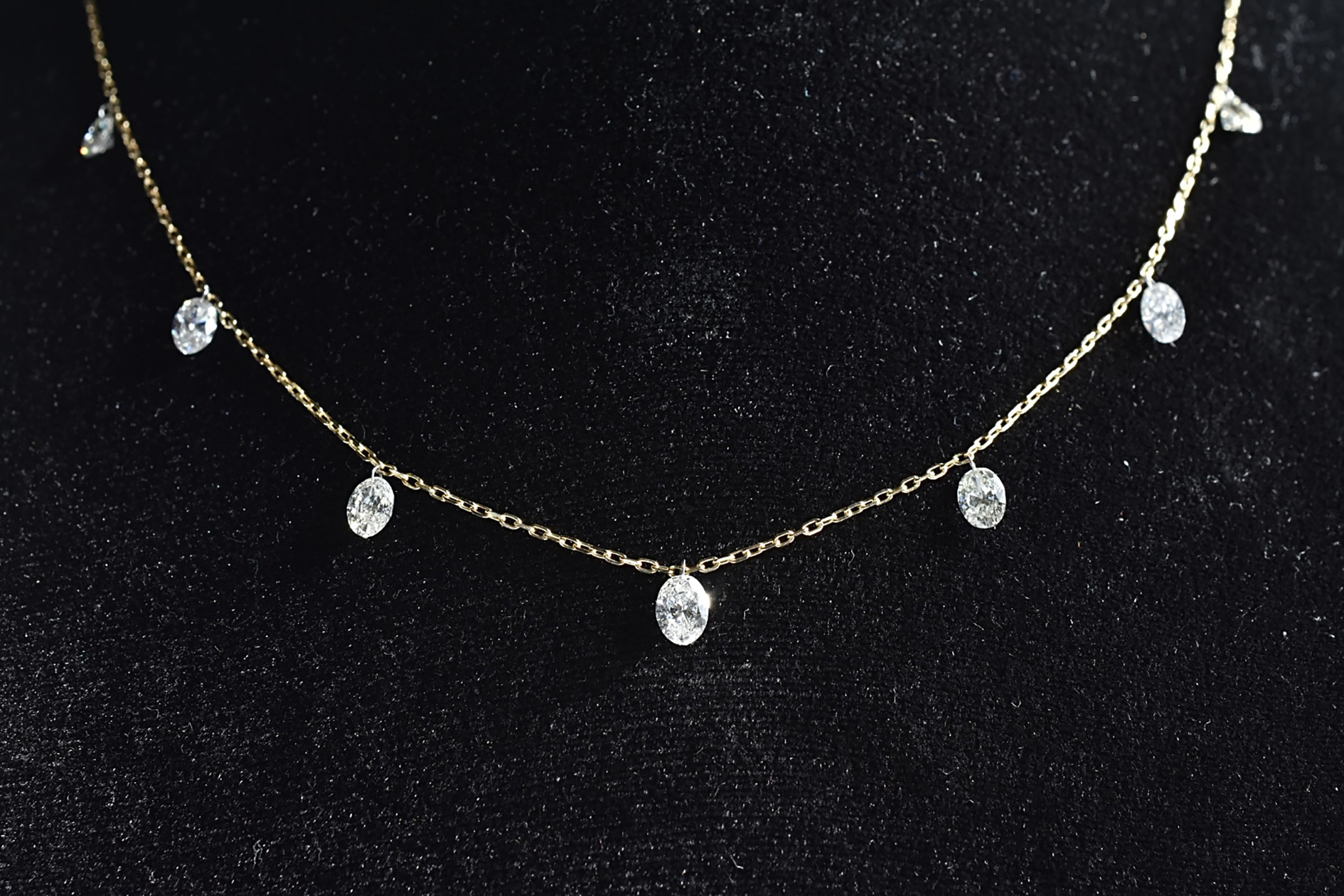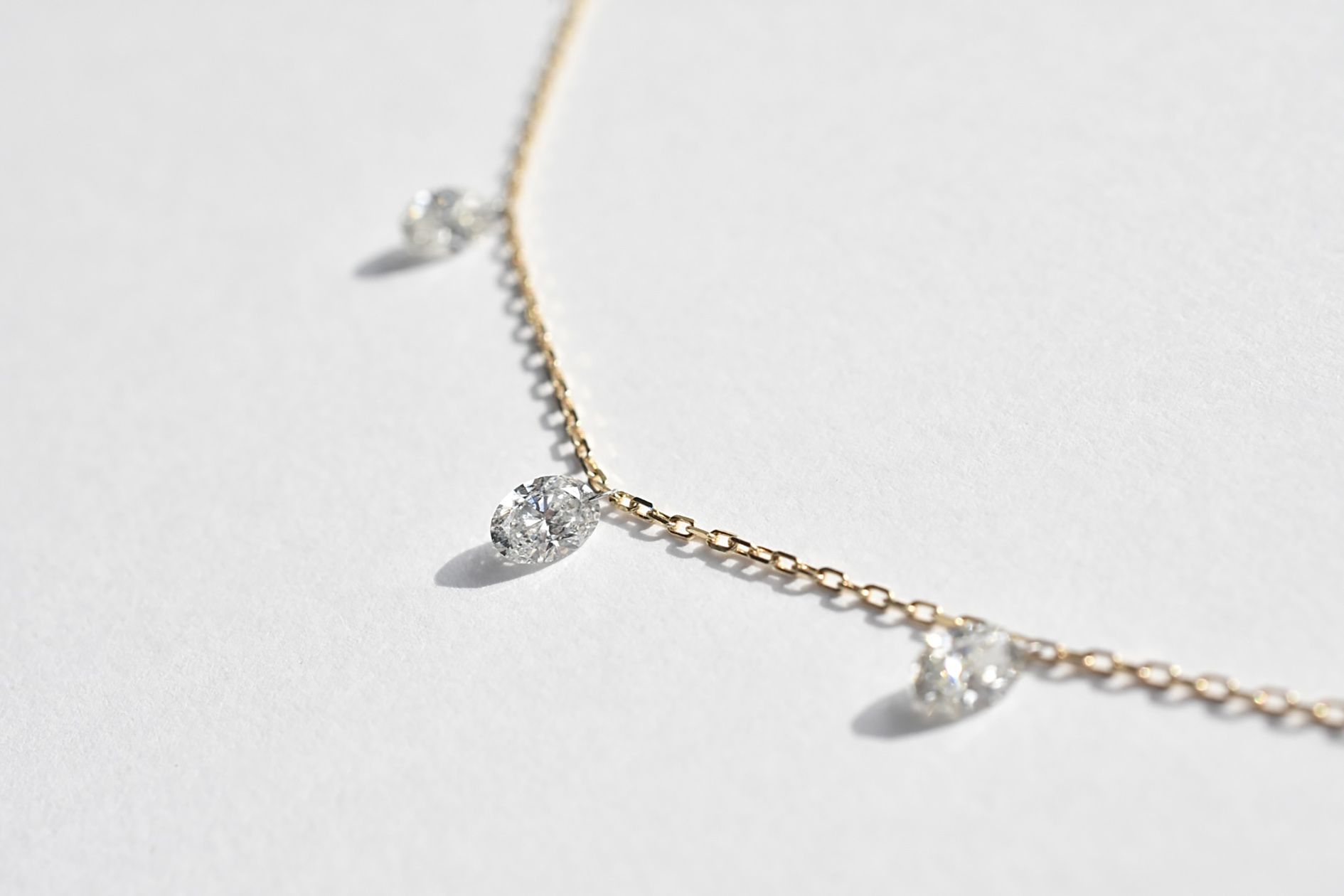 7石のオーバルカットダイヤモンドが等間隔に並び、揺れ動くさまは、