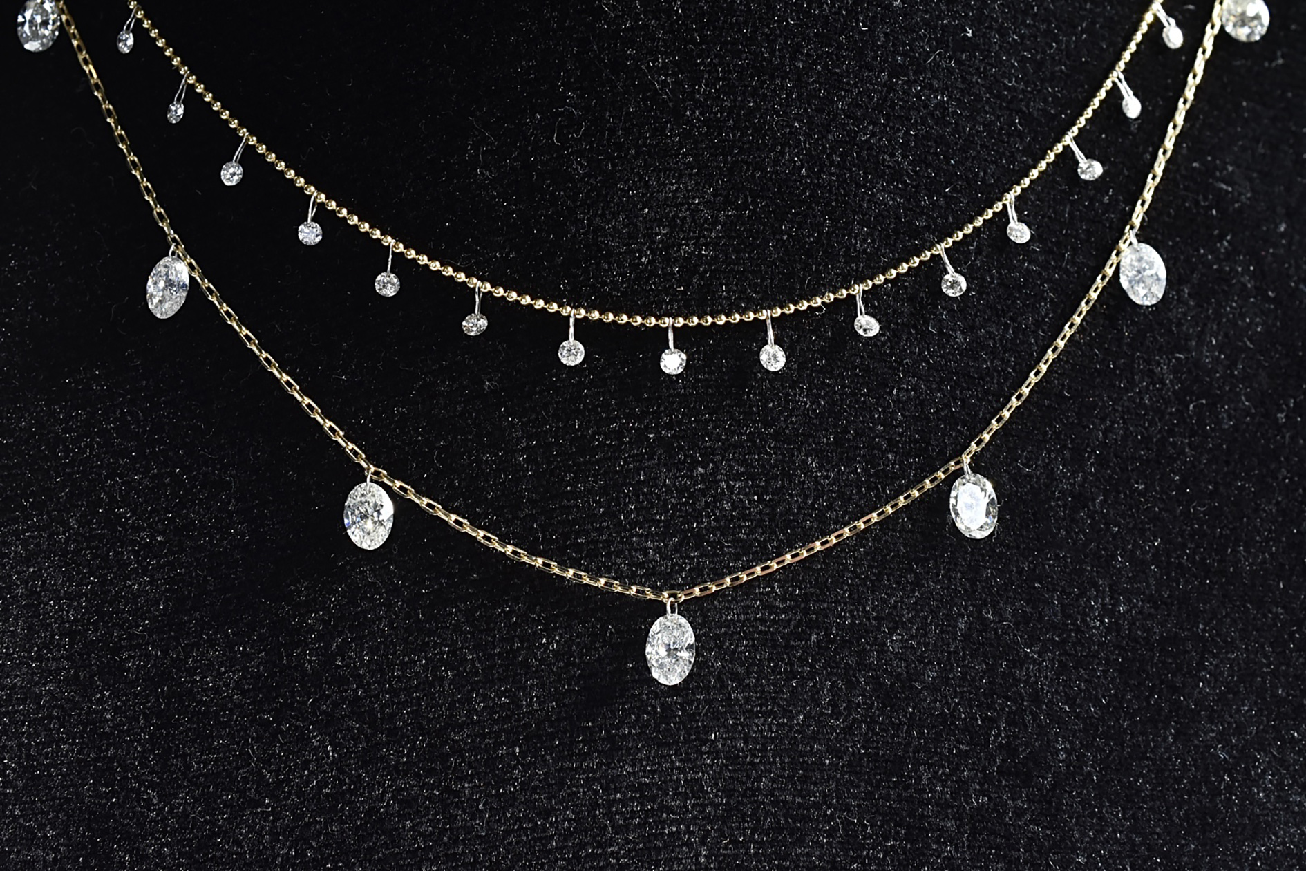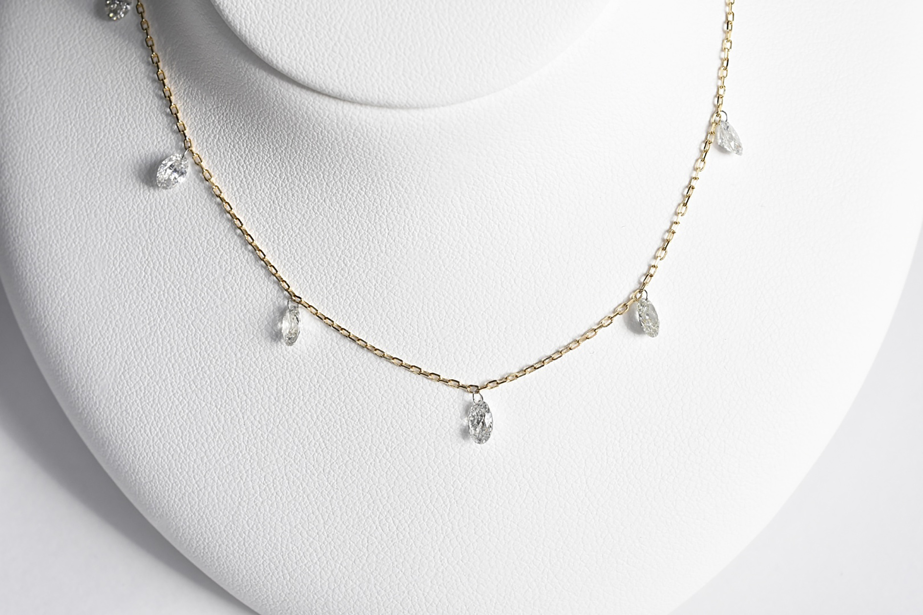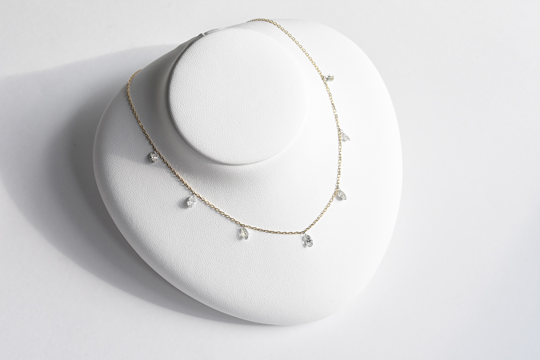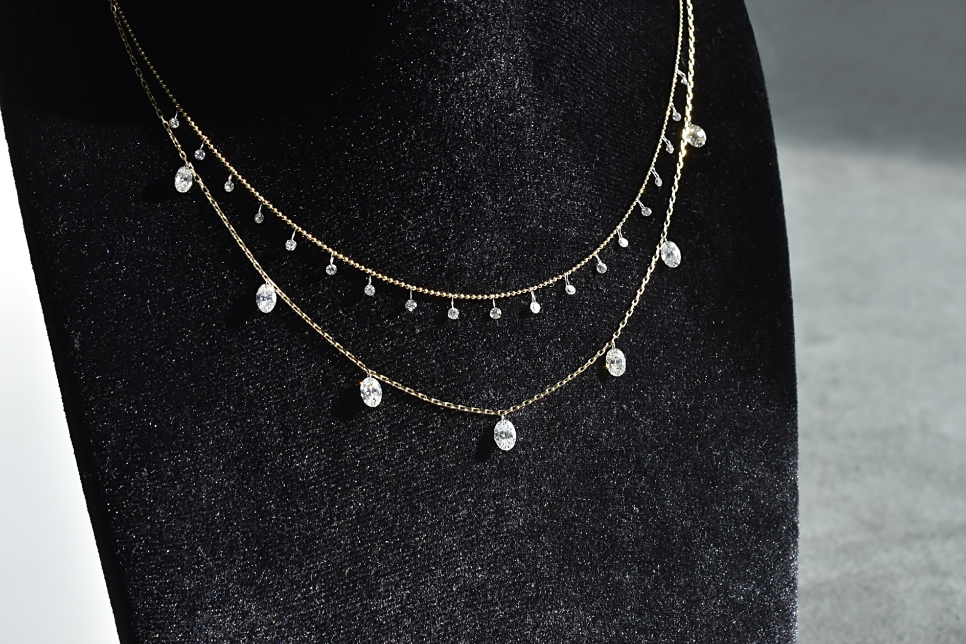 7石のオーバルカットダイヤモンドが等間隔に並び、揺れ動くさまは、